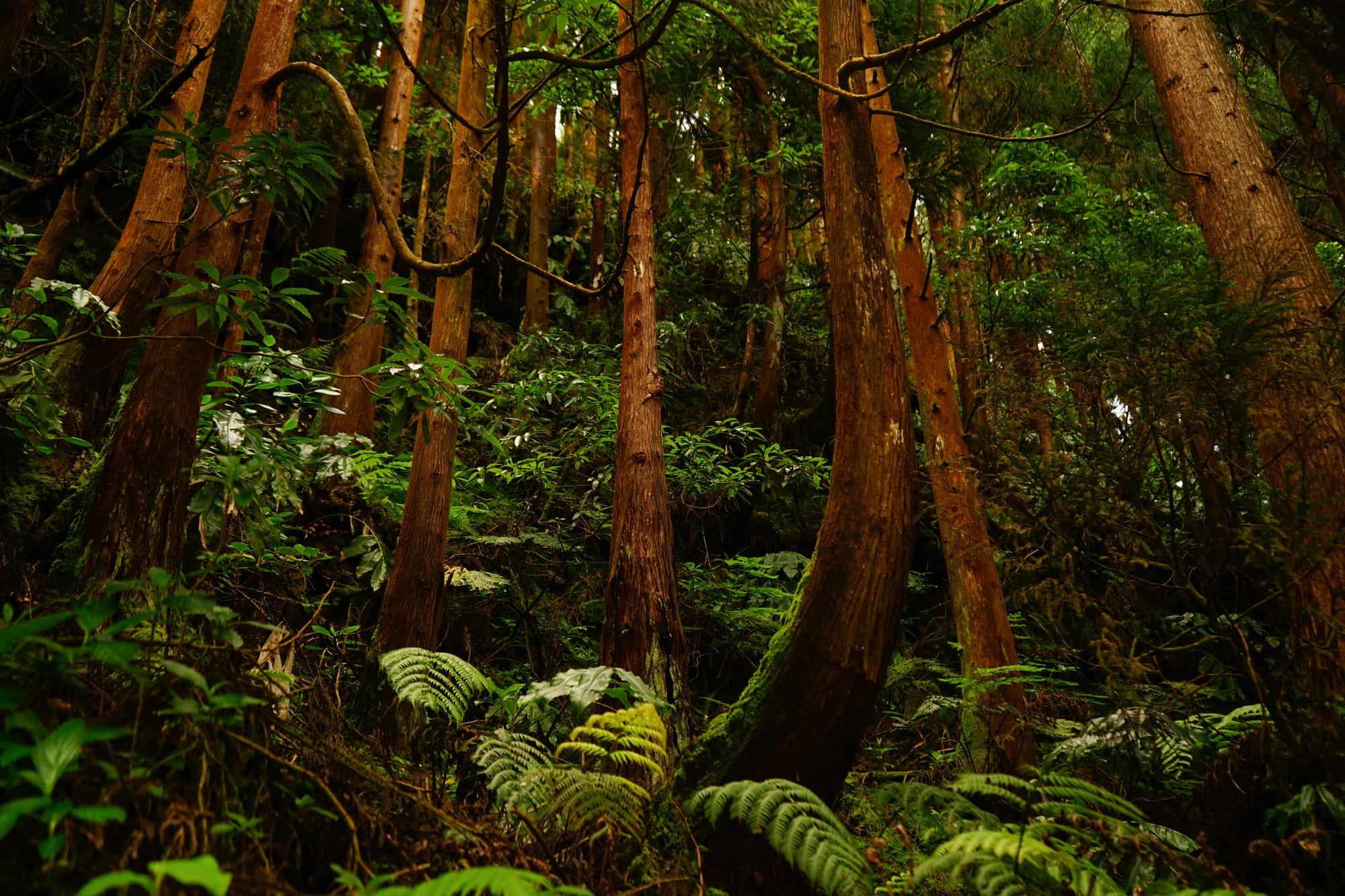A formare l'architettura principale sono i patriarchi della foresta. Il lauro azorico (Laurus azorica) è l'anima del bosco, con i suoi tronchi contorti e scuri, spesso coperti da un velluto di muschi e da barbe di licheni che pendono come testimonianze del tempo e della purezza assoluta dell'aria. Accanto a lui, il Picconia azorica, o pau-branco, si erge come un fantasma gentile, con la sua corteccia più chiara e liscia. Meno appariscente, ma fondamentale, è l'agrifoglio locale (Ilex azorica), che qui si sviluppa in un albero maestoso, un esempio di quel gigantismo insulare che affascina i biologi. A quote più elevate, dove il vento si fa più insistente, il ginepro delle Azzorre (Juniperus brevifolia) domina la scena: ogni albero è un microcosmo, un universo che ospita decine di altre specie, dalle felci epifite ai funghi più rari.