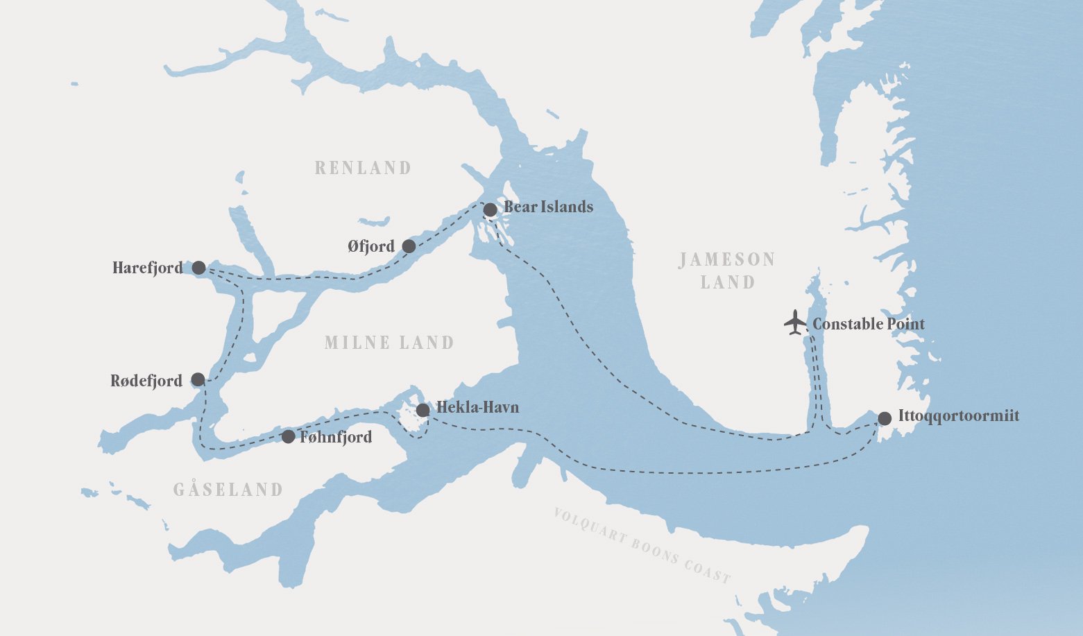 Per otto giorni e sette notti, navigheremo intorno al magnifico Scoresby Sound, il sistema di fiordi più grande del mondo, ricco di natura e paesaggi mozzafiato. Grazie all’esperienza e alla conoscenza pluriennale della zona del nostro partner locale - con il quale lo scorso anno abbiamo già navigato in acque artiche fino all’isola di Grímsey - vivremo un’esperienza di viaggio autentica e rara.